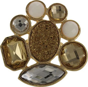 Faceted stones arranged in a flower shape center upon this drusy ring crafted from goldtone plate.