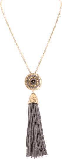 Show off boho-chic shine with this beaded medallion and corded tassel-drop pendant necklace boasting a hammered finish to catch the light.
