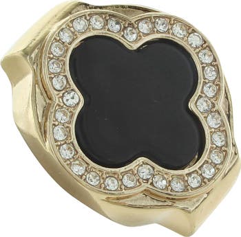 A polished clover surrounded by crystal pavé sparkles and shines on this golden ring.