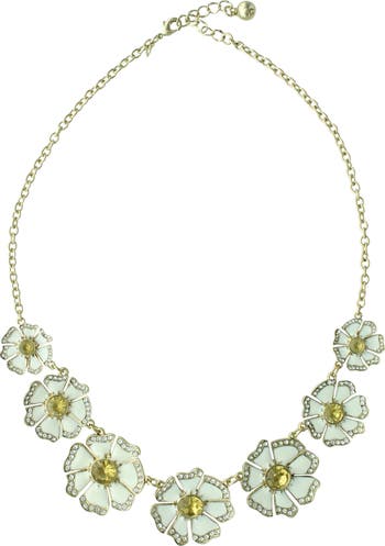 A romantic floral necklace features enamel flowers illuminated by sparkly crystals for elegant style.