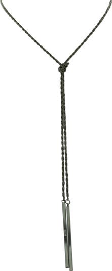 A slender necklace shaped from rope chain features a central knot and bar-shaped drops to bring a rugged attitude to casual or elevated looks.