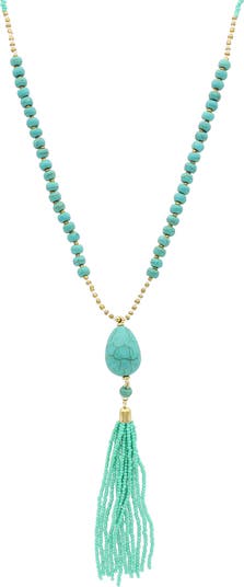 Show off boho-chic style with this swingy tassel-drop necklace brightened by seed beads and faux-turquoise stones.
