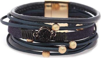 Go boho with this multi-strand faux leather bracelet featuring gold-tone beads and a drusy stone accent.