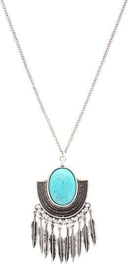 Show off boho-chic style with this bold pendant necklace featuring a faux-turquoise oval framed by chain-textured hardware and swingy feather charms.
