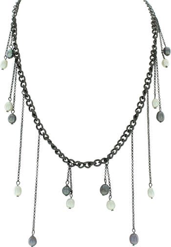 Beautiful imitation pearls suspend from linear drops on a gunmetal curb chain necklace for chic, contemporary style.