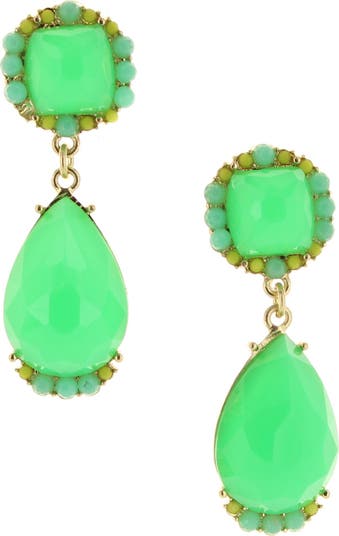 Add a pop of glamorous color to your lobe look with these double-drop earrings featuring square and pearl-shaped faceted stones surrounded by beads.