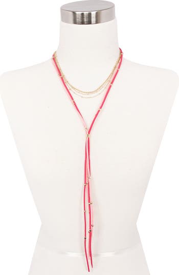 A sophisticated and refined suede and metal beaded necklace offers a sleek style for any look.