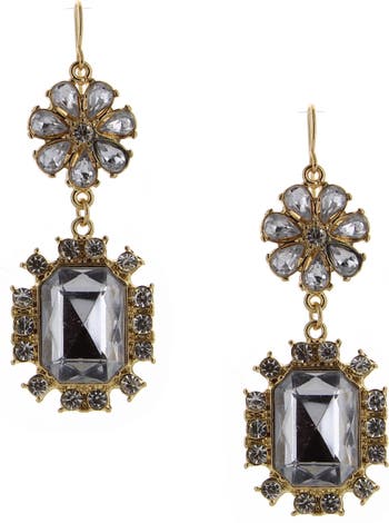 An antique-finished goldtone plate offers rustic appeal to intricate statement drop earrings inlaid with brilliant crystals for an ethereal appeal.