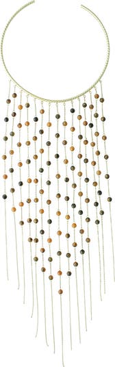 A waterfall of bright, faceted beads dangle from a slender collar to complete this eye catching bib necklace.