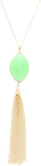 A tinted gemstone and gleaming chain tassel pendant adds bohemian flair to your street style.
