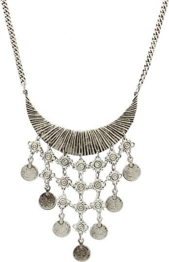 Burnished details bring depth and dimension to a statement-making necklace that emboldens casual looks.