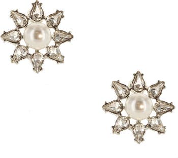 Round imitation pearls center studs earrings finished with a halo of teardrop-shaped crystals.