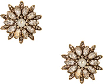 Faceted marquise and round crystals in various sizes sparkle from these brassy, flower-shaped statement earrings.