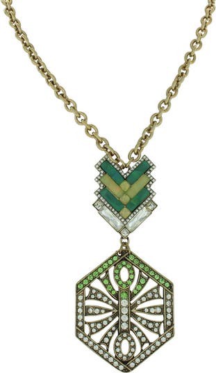 Bring statement style to your wardrobe with this burnished gold-tone necklace suspending a dramatic pendant with sparkling rhinestone crystals.