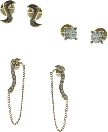 Simple, curved lines and luminous crystals decorate a trio of antique finished gold-tone earrings that pair well together for an on-trend ear-party look.