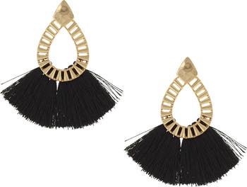 Add a gleaming finish to your look with these teardrop cutout earrings featuring fanned fabric threads.
