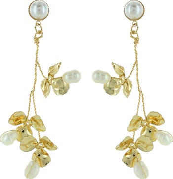 Delicately branching wire drop earrings offer nature-inspired shine with lustrous imitation pearls nestled amidst glossy goldtone leaves.