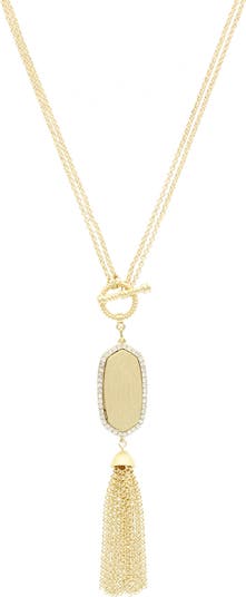 A geometric pendant with a crystal halo suspends a darling chain tassel and is strung on a dainty chain necklace.