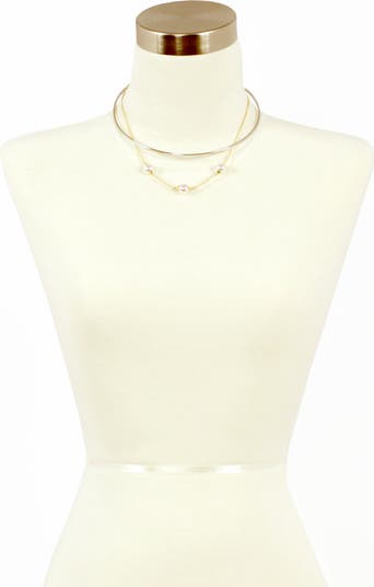 Instantly create a layered effect with this double-strand choker necklace showcasing a smooth collar and a trio of lustrous faux pearls.