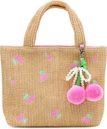 The perfect beach bag, this straw tote brightened with strawberry poms and embroidery is spacious enough for their warm-weather essentials.
