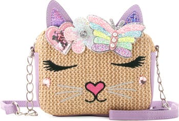 An animal face and ears brings kid-approved whimsy to a straw crossbody bag detailed with glitter and crystals to shimmer and shine against everyday looks.