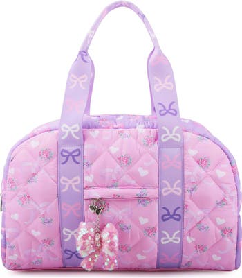 Perfect for practice or sleepovers, this charming duffle bag is decorated with diamond-quilt stitching, a blossoming allover print and spacious interior for all her gear.