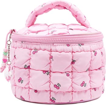 Puffy quilting and adorable cherry graphics lend sweet styling to a train case that has an ultraspacious interior to fit makeup, accessories and more.