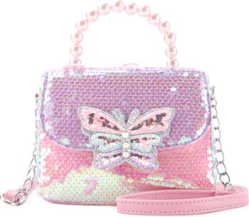 Allover embellishments and a butterfly centerpiece lend kid-approved whimsy to a convertible bag that can be carried by the top handles or crossbody strap.