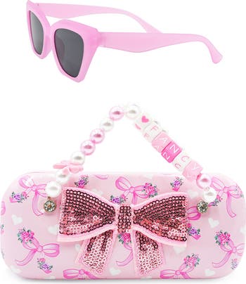 Give your kid glam sunny-day style with this two-piece set including cat-eye sunglasses and a sequin bow–embellished case framed by pearly beaded handles.