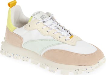 Colorblocked leather and recycled-nylon panels compose a sporty low-top sneaker grounded by a toothy lug sole to offer a cool and casual look.