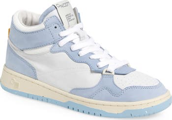 Colorblocked leather and recycled-nylon panels compose a sporty high-top sneaker grounded by sporty two-tone sole to offer a cool and casual look.