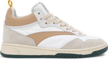 Colorblock panels enhance the retro vibe of this mid-top sneaker constructed from smooth leather and recycled-nylon panels grounded by a durable grip sole.