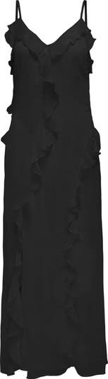 Flowy ruffles trace the V-neckline and the front of this breezy maxi dress topped with adjustable straps.