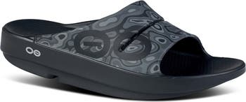 Enjoy the comfort of this sporty, lightweight slide sandal boasting an impact-absorbing OOfoam™ footbed with a cupped heel and a rocker grip sole.