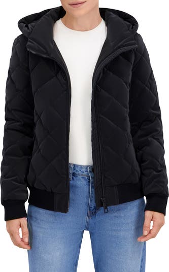 Streamlined channel quilting lends an extra element of comfort to a puffer jacket punctuated by a spacious hood for extra protection on chilly outings.