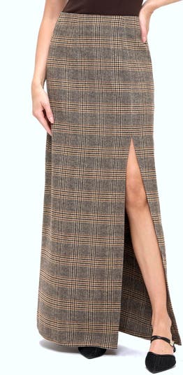 A classy glen plaid print elevates this soft knit maxi skirt fashioned in a high-waisted silhouette that's punctuated by a flirty thigh-high slit.