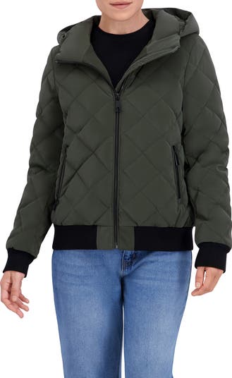 Brave the chill in this quilted bomber jacket designed with a hood, zipper pockets and ribbed trim.