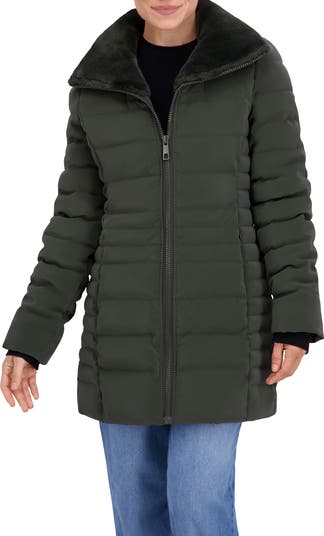 | Brave the chill in this stadium puffer jacket designed with a faux-fur collar and zipper pockets. |
