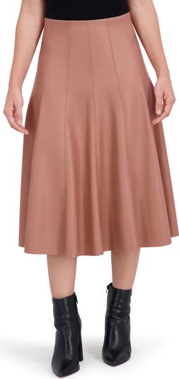 Perfect for a day or night out, this ultrasoft faux-leather midi skirt is cut in a paneled A-line silhouette that flutters with every step.