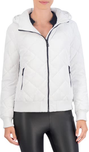 Stay warm in this water-resistant quilted bomber jacket constructed with an attached hood, secure zip pockets and comfortable ribbed trim.