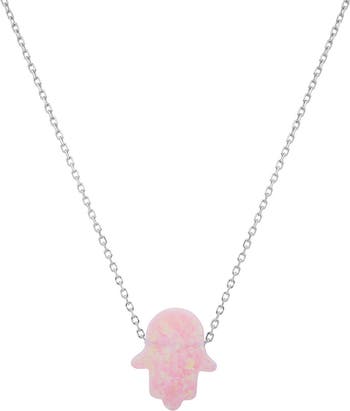 A Hamsa-shaped opal acts as the centerpiece of a chain necklace complete with a polished finish for extra shine.