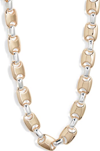 Mixed metallic links make this collar necklace a sophisticated and modern statement piece.