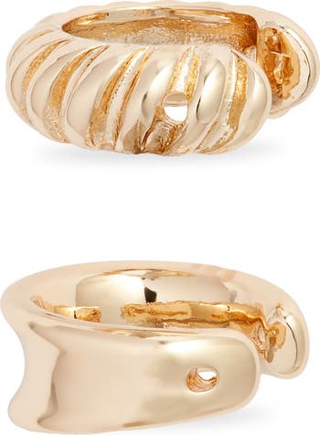 These polished ear cuffs are shaped with ribbed and concave silhouette that bring dimensional shine to your ears.