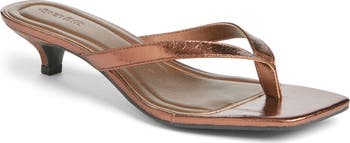 A kitten heel adds a sophisticated finish to an understated sandal topped with sleek faux-leather straps.