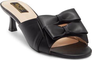 A pair of bows and shimmering golden finish captivate on an elegant faux-leather mule balancing a rounded toe and slender heel.