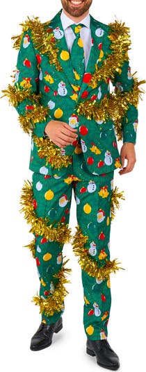 Decorated trees and golden tinsel bring Christmas cheer to this trim-fit suit that keeps you reveling all season in a jacket, pants and matching tie.