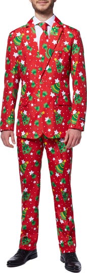 Decorated trees and whimsical stars bring Christmas cheer to this trim-fit suit that keeps you reveling all season in a jacket, pants and matching tie. Let's celebrate in style by suiting up in the most festive way possible. This red Christmas suit covered in pine trees will instantly get you in the merry mood. The slim fit outfit consists of a jacket, pants and a tie. The pants have an elastic waistband for a comfortable fit.
