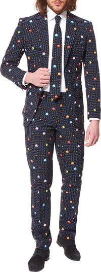 Got an interview at a video game company or just want to hit the arcade in style? Drop the joystick, ditch the sweatpants and T-shirt and step into the modern world in this incredibly fun two-piece suit. Tailored in a trim fit, it includes a two-piece suit jacket and trousers with matching tie, covered in a whimsical print of the classic arcade game.