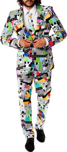 OppoSuits interrupts your boring, preprogrammed style with a bold, eye-catching two-piece suit covered in a retro television test-card pattern. Tailored in a modern fit, it includes a two-button jacket, trousers and a matching tie to pull the whole look together. Stay tuned for flattering compliments.