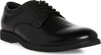 Light cushioning and a slip-resistant rubber sole support your foot in a derby crafted from faux leather with a shiny finish.
